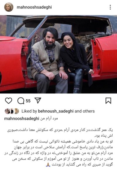 دلنوشته مهنوش صادقی برای همسرش مهدی هاشمی، در پشت صحنه فیلم “مرد آرام”