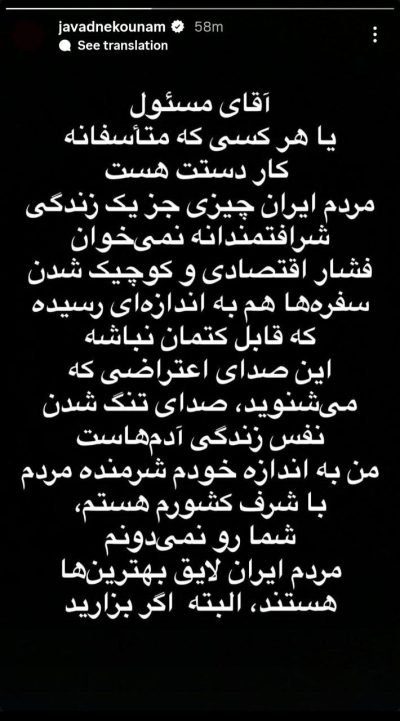 جواد نکونام، سرمربی سابق استقلال با انتشار پیامی در فضای مجازی به اعتراضات اخیر مردم واکنش نشان داد.